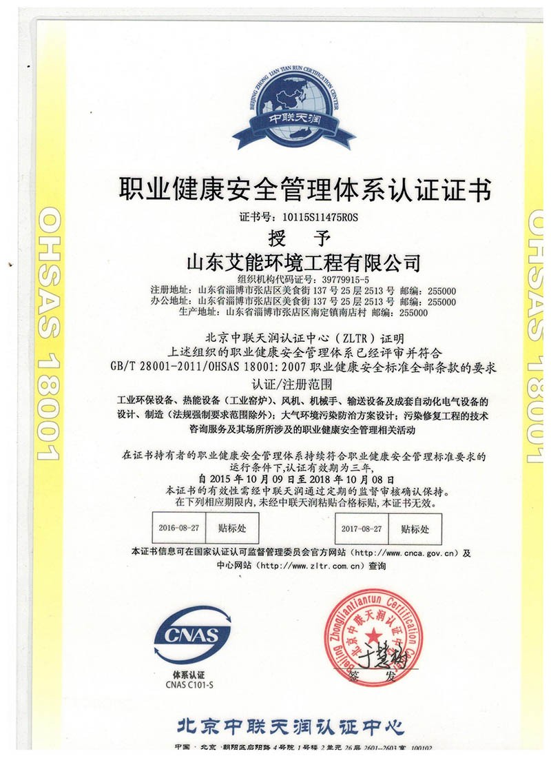职业健康安全管理体系认证证书